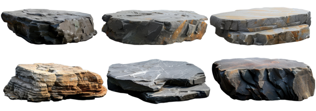Collection set of long flat big hard rock boulder stone podium stage display on withe background cutout, PNG file