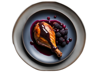 Top view of a dark plate featuring a large confit turkey drumstick with smooth haskap berry sauce.