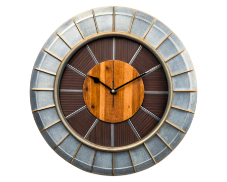 Large industrial-style wall clock with wood and metal design on a transparent background