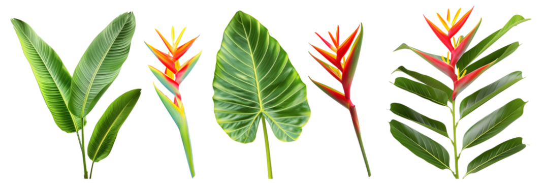 set of mixes of heliconia with palm leaves, isolated on transparent background