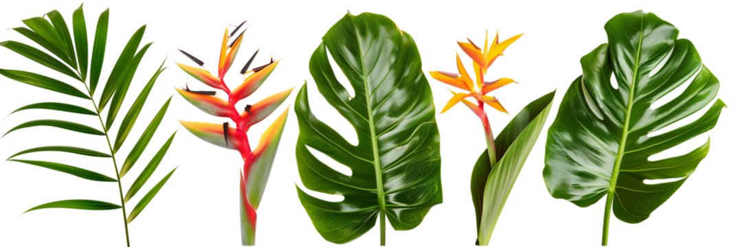set of displays of heliconia with palm fronds and monstera leaves, isolated on transparent background