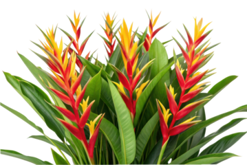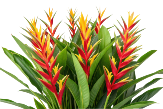 Vibrant heliconia plant in white pot against a dramatic transparent background perfect for design