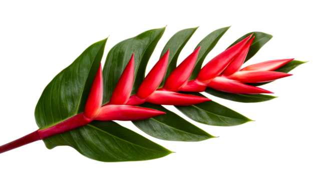 Heliconia flower blooming, vibrant red petals and green leaf on transparent background, symbolizing tropical beauty