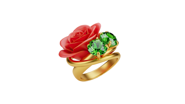 3D Gold ring with red rose and green gemstones on transparent background