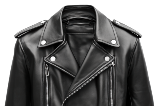 Black leather jacket vest in front and back view, mockup isolated on transparent background