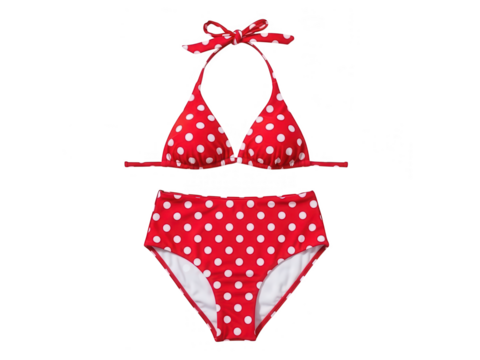 A red and white polka dot bikini set isolated on a black background