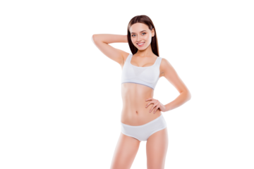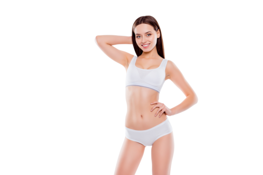 Portrait of fit slender woman with perfect body in white cotton underwear bikini posing looking at camera isolated on white background