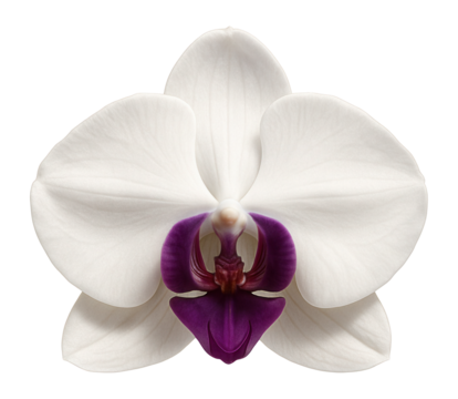 Orchid flower with bilateral symmetry, white petals, and a striking purple labellum