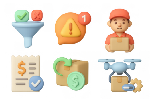 Realistic 3d rendering of a cardboard shipping box with a blue receipt showing a dollar sign and arrows indicating proper handling isolated on transparent background