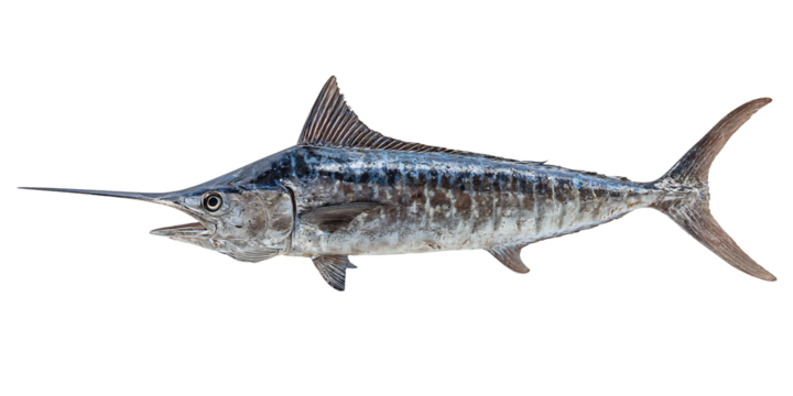 Isolated marlin fish with long bill, side view, aquatic creature, sea animal, saltwater fish