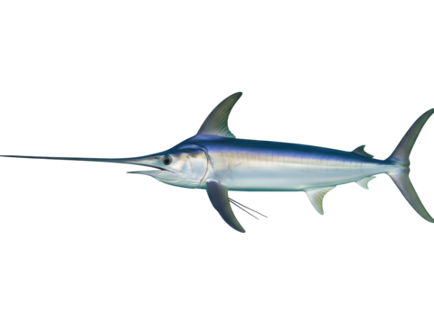 A detailed studio shot of a large swordfish with its distinctive bill and fins isolated on a transparent background