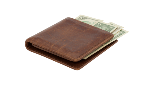 Brown leather wallet with dollar bills inside, isolated on a black background. The wallet is weathered, suggesting age and character.