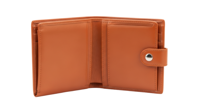 Brown leather bifold wallet open showing card slots and id window isolated on transparent background
