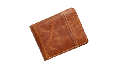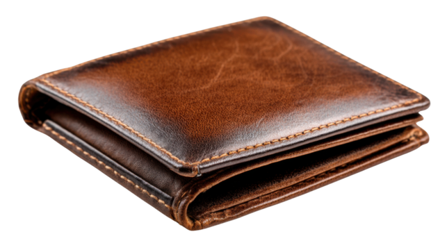 Brown leather wallet representing personal finance, luxury wealth, security, and savings on transparent background