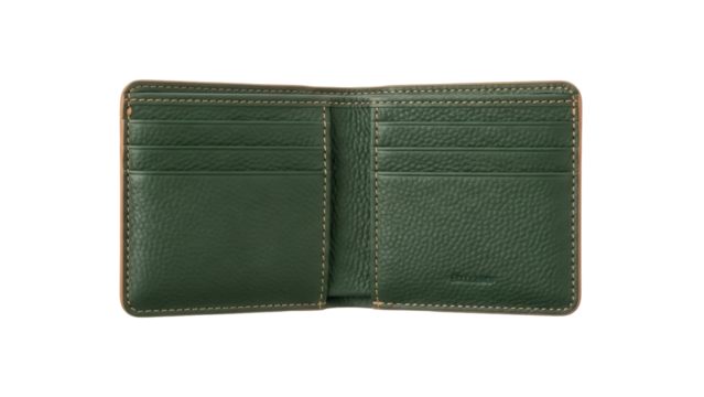 Isolated, open green leather wallet with pockets and seams, perfect for carrying cards or cash