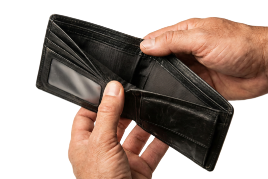 Man's hands holding an open, empty black leather wallet, showing no money. Isolated on transparent background, png