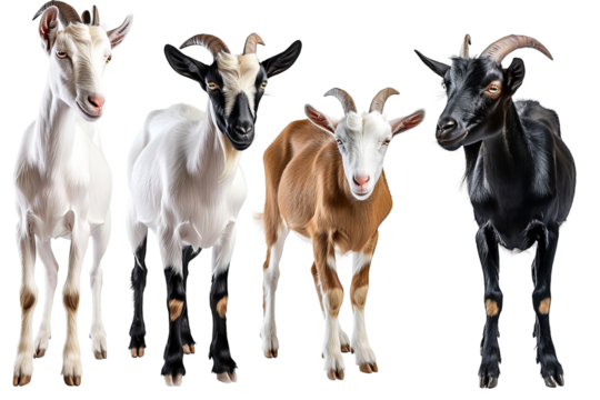 Four goats of different colors and breeds isolated on a transparent background