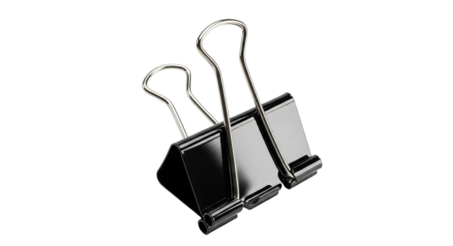 Black binder clip on transparent background holding papers together