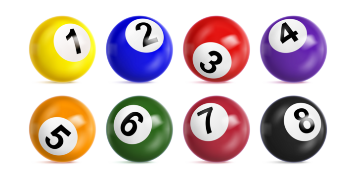 Eight colorful bingo lottery balls numbered 1 through 8, with realistic shading and highlights, isolated on transparent background, representing games of chance and luck.