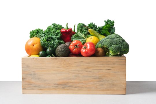 Wooden box with set of vegetables and fruits.  Concept of zero waste shopping, delivery of organic products