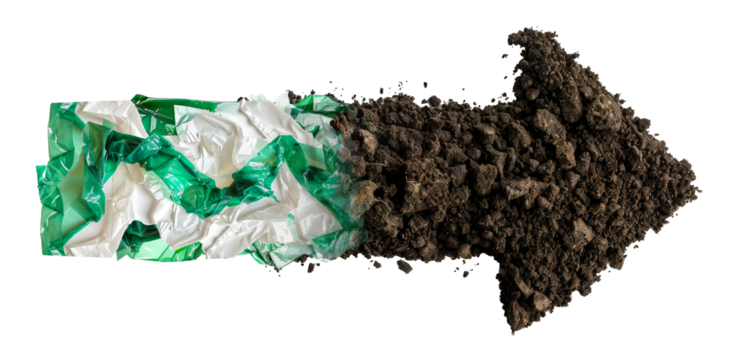 biodegradable compostable recyclable packaging material icon logo infographic isolated on transparent background. arrow symbol made of soil and  plastic bag, eco friendly plant based plastic concept