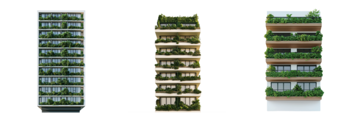 Modern green building with plants on balconies, isolated on transparent background, showcasing sustainable urban architecture and ecofriendly design