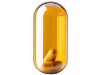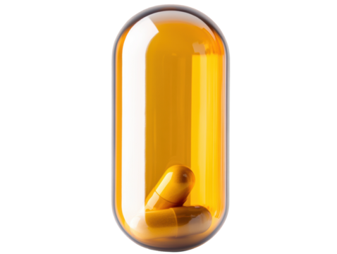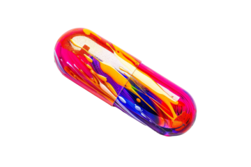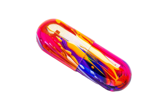 Unique amber capsule containing smaller pills in vibrant colors on a transparent background, cut out