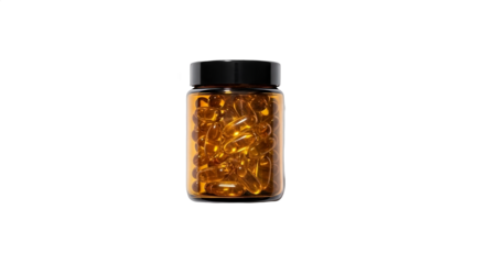 Transparent jar filled with golden capsules on a white background showcasing dietary supplements and health products for wellness and nutritional benefits.