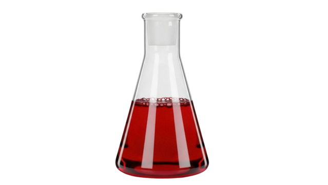 Erlenmeyer flask with red liquid isolated PNG, laboratory glassware for scientific experiments and chemical research on transparent