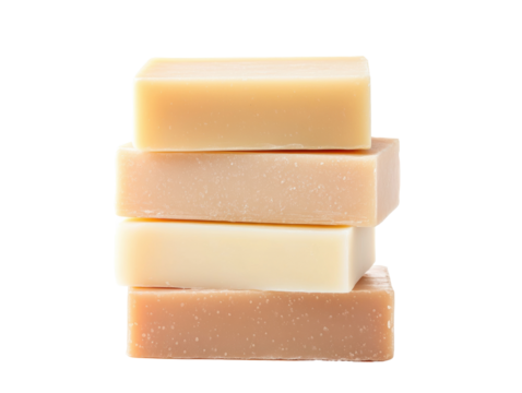 Natural handmade soap bars stacked for wellness and bathing experience on a transparent background, cut out