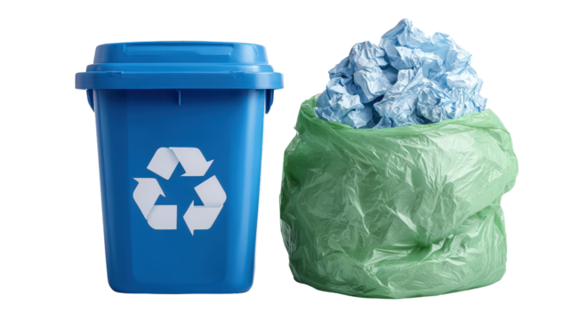 Crumpled plastic bag next to recycling bin background isolated on a Transparent background, PNG file.