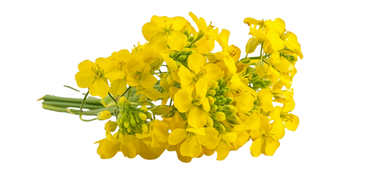 bouquet of rapeseed flowers isolated on a white background, top view. vibrant yellow canola flower bunch, rapeseed or mustard plants. cooking oil and biogas plant products concept. high-quality photo.