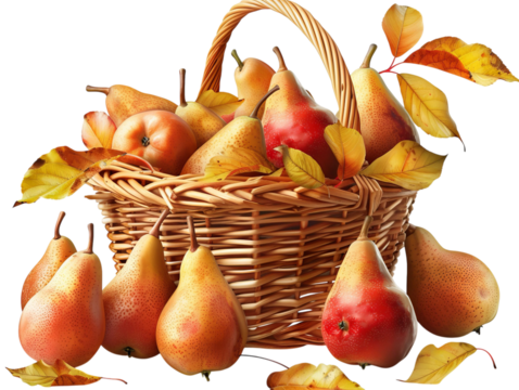 A vibrant basket of autumn pears, featuring a mix of red and yellow hues, surrounded by colorful leaves.