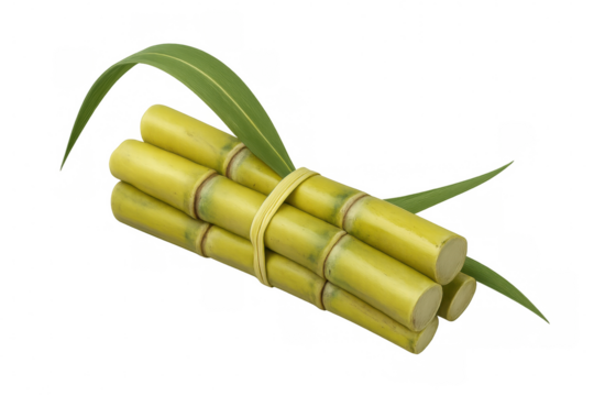 Sugarcane stalks tied together with green leaves, naturally sweet crop used for sugar production, transparent background