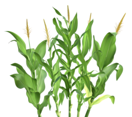 realistic photograph of a dense cluster of tall green corn stalks (maize plants), showcasing large leaves and developing tassels, expertly isolated against a solid transparent background.