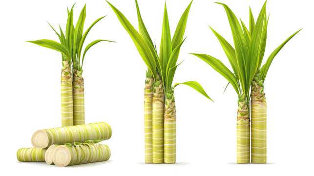 Freshly cut green sugarcane stalks, showing natural texture and segmented nodes, ready for sugar extraction. Isolated on a vibrant transparent background. background removed