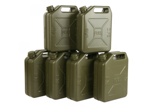 Stack of Olive Green Fuel Jerry Cans isolated on a transparent background