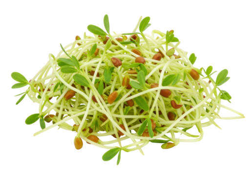 Isolated heap of fresh alfalfa sprouts with tiny light brown seeds over light stems