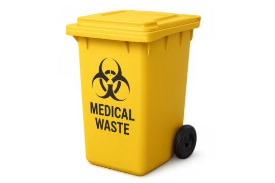 Yellow container for medical waste disposal with biohazard symbol on transparent background