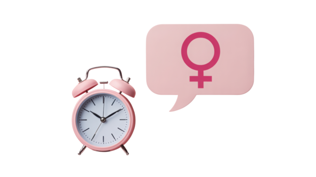 A delicate pink alarm clock indicating the passage of time is placed next to a soft pink thought bubble featuring a distinct female gender symbol all