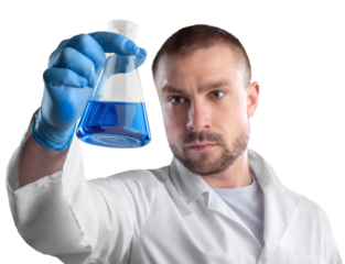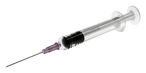A 3D rendering of a syringe filled with light blue liquid, isolated on a transparent background. background removed