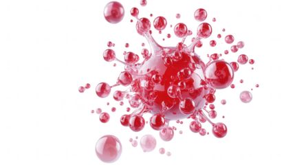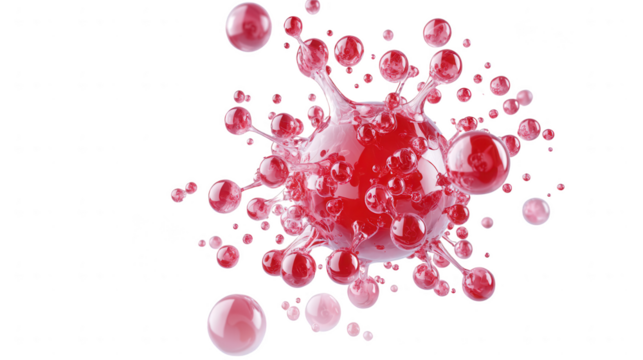 A vibrant red virus with droplets, symbolizing infection and disease in a scientific context.