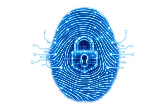A metallic padlock with a fingerprint overlay, suggesting biometric security