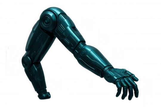 Metallic robotic arm extending forward, isolated on a transparent background, showcasing futuristic technology