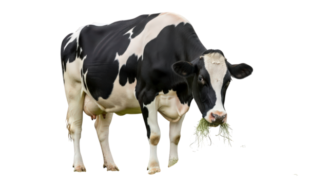 Cow eating grass with mouthful of fresh green hay
