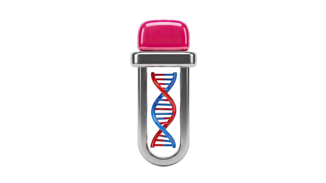 Abstract 3D rendering of a vibrant iridescent double helix dna strand with polished texture, twisting on a transparent background with copy space, concept of genetics and biotechnology