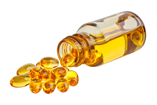 Close-up of a jar with yellow capsules spilling out. Represents health, vitamins, and supplement concepts.