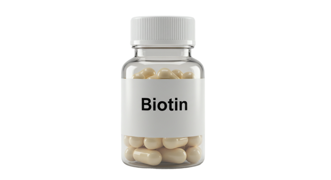 Minimalist Transparent Biotin Supplement Bottle with White Capsules on Isolated Background