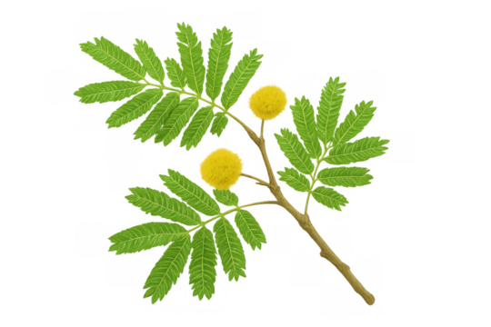 Mimosa sprig displaying delicate yellow blossoms and green bipinnate foliage, botanically detailed against transparent background