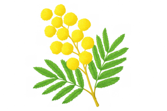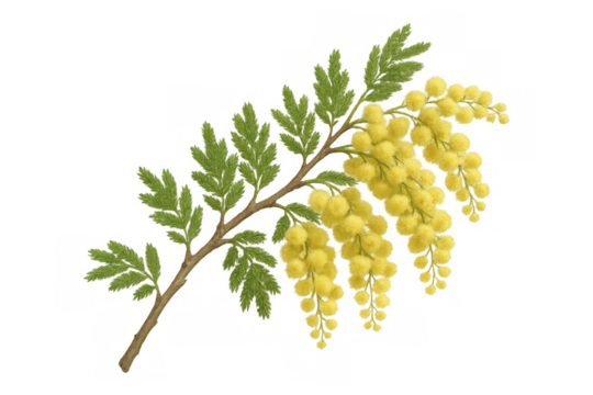 Delicate mimosa sprig displaying soft yellow blooms and verdant foliage, rendered with precision against transparent backdrop